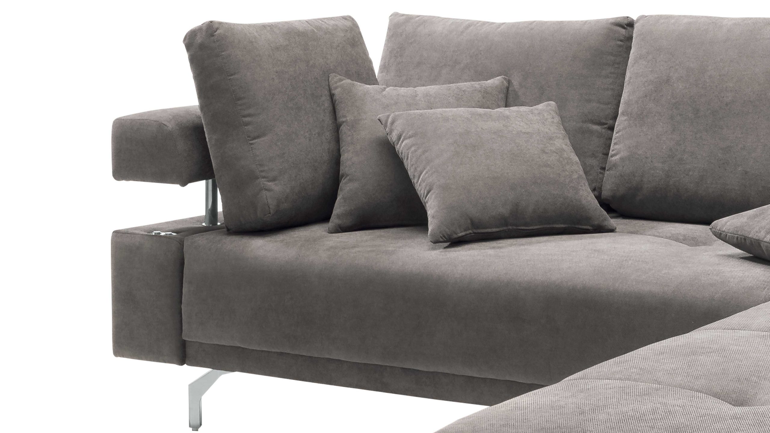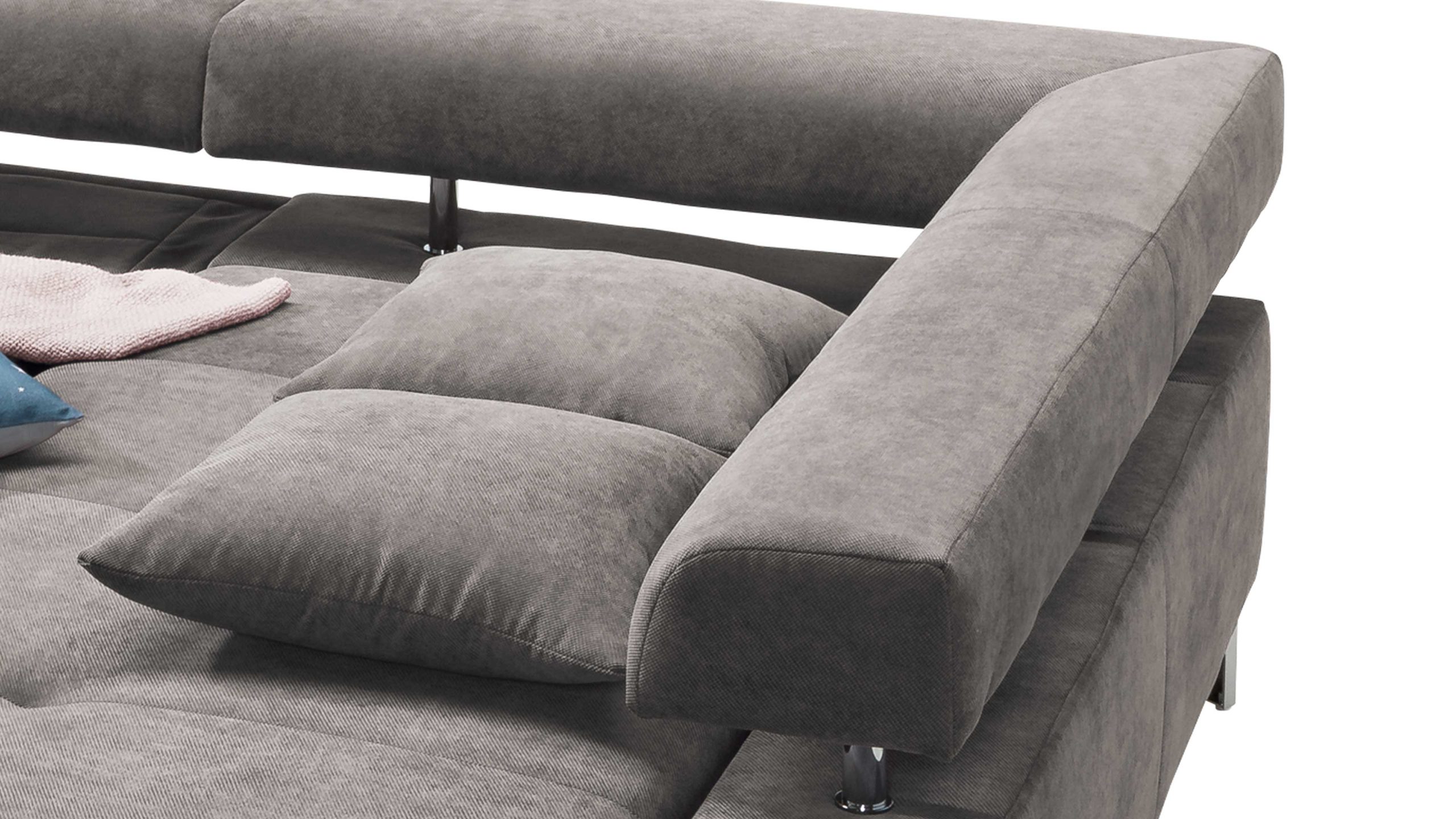 Klassisch und zeitlos passt die geschmackvolle Polstergarnitur mit dem grauen Bezug und den formschönen Metallfüßen optimal in jedes Wohnzimmer. Aber auch in Sachen Komfort hat diese Lounge-Eckcouch einiges zu bieten. Denn die Federung ist aus Bonnellfederkern auf Nosagunterfederung. Zudem sind alle Rücken des Polstermöbels stoffbezogen. Auch die motorische Sitztiefenverstellung (ca. 30 cm) der Polsterecke und die losen Kissen sind inklusive.