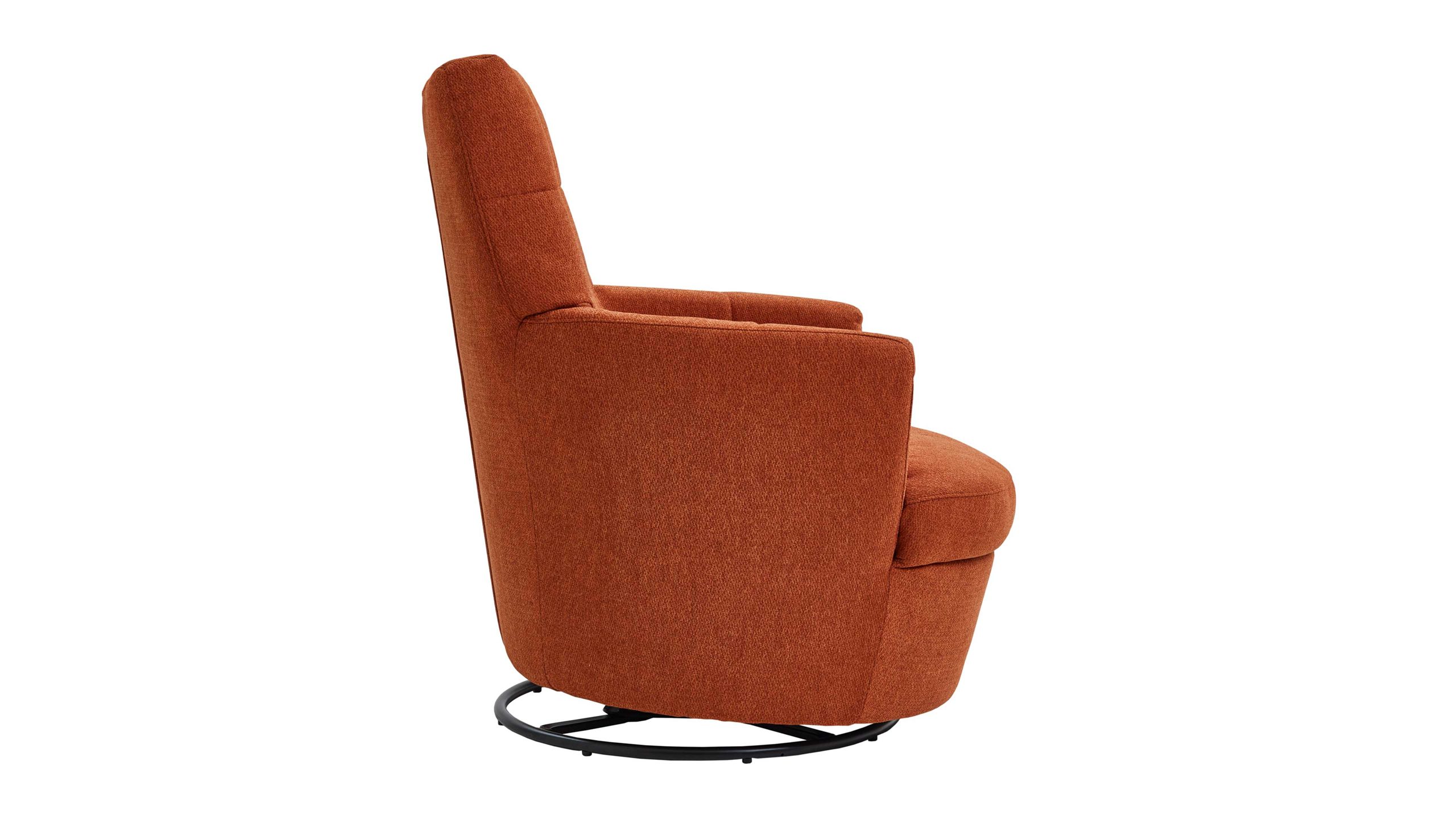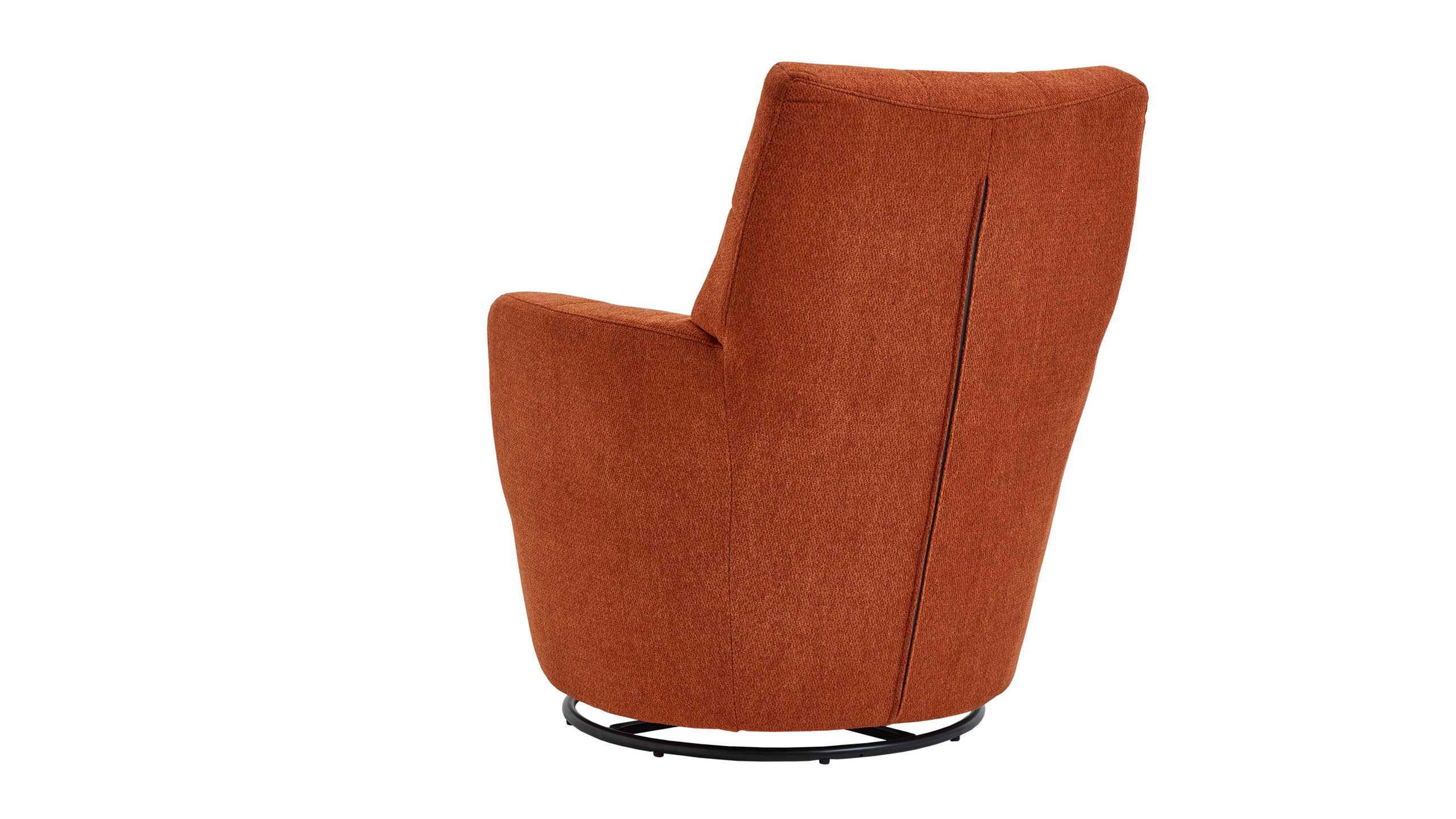 Mit seinem Signal-orangen Strukturbezug und dem schwarzen Metalldrehring wird dieser Sessel zum Blickfang in jedem Raum.