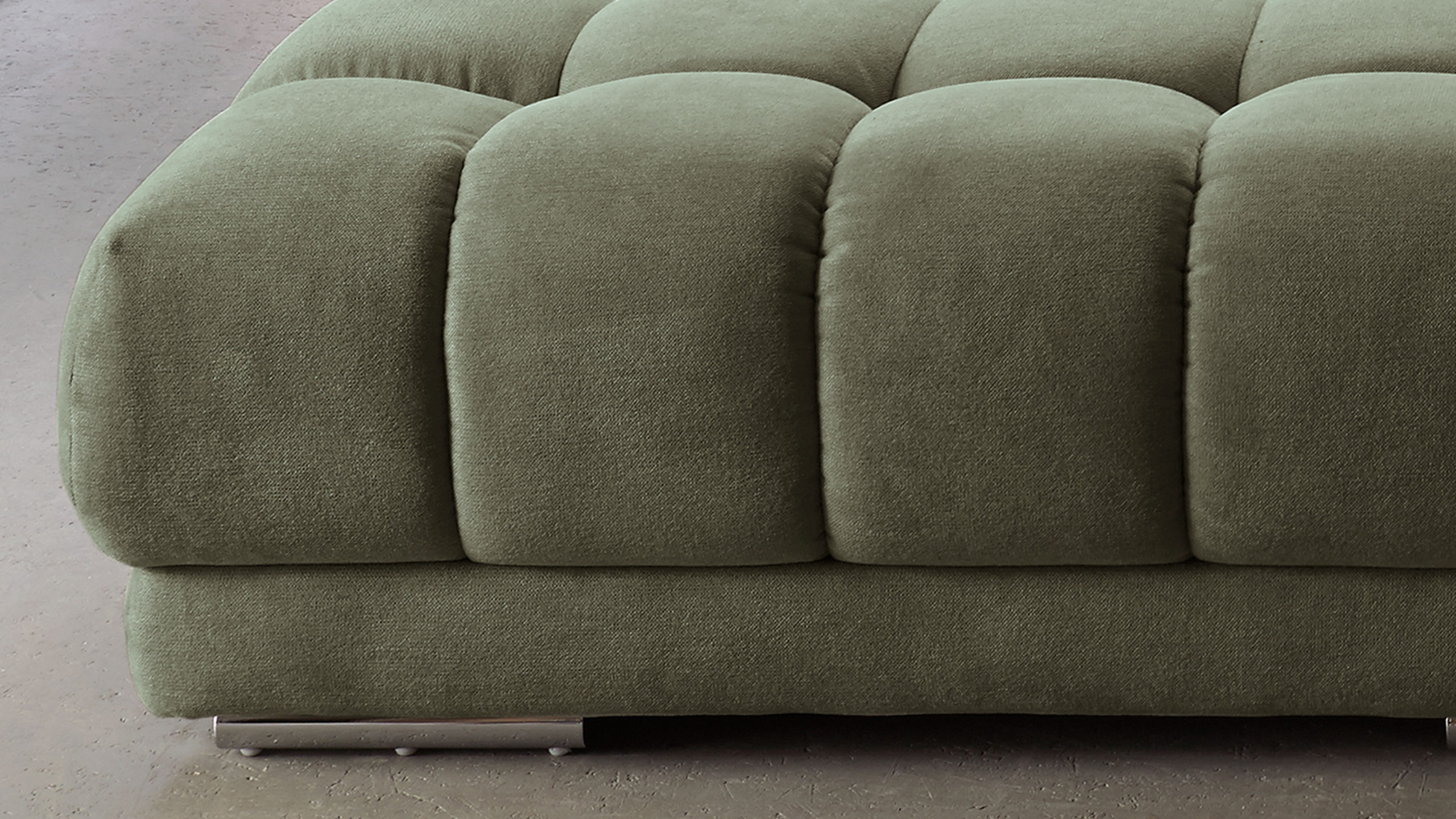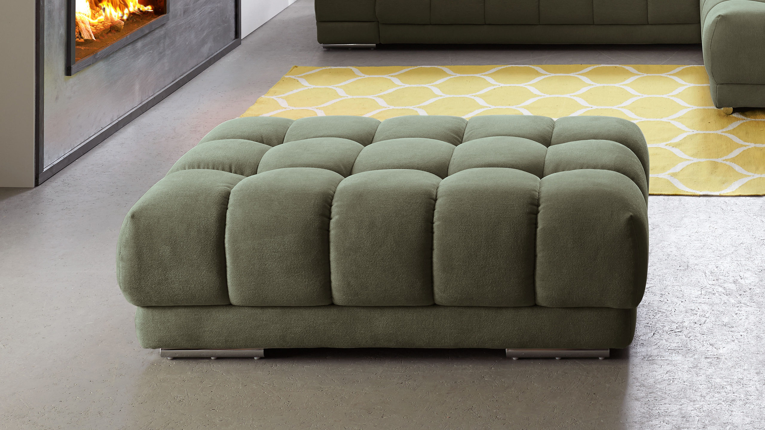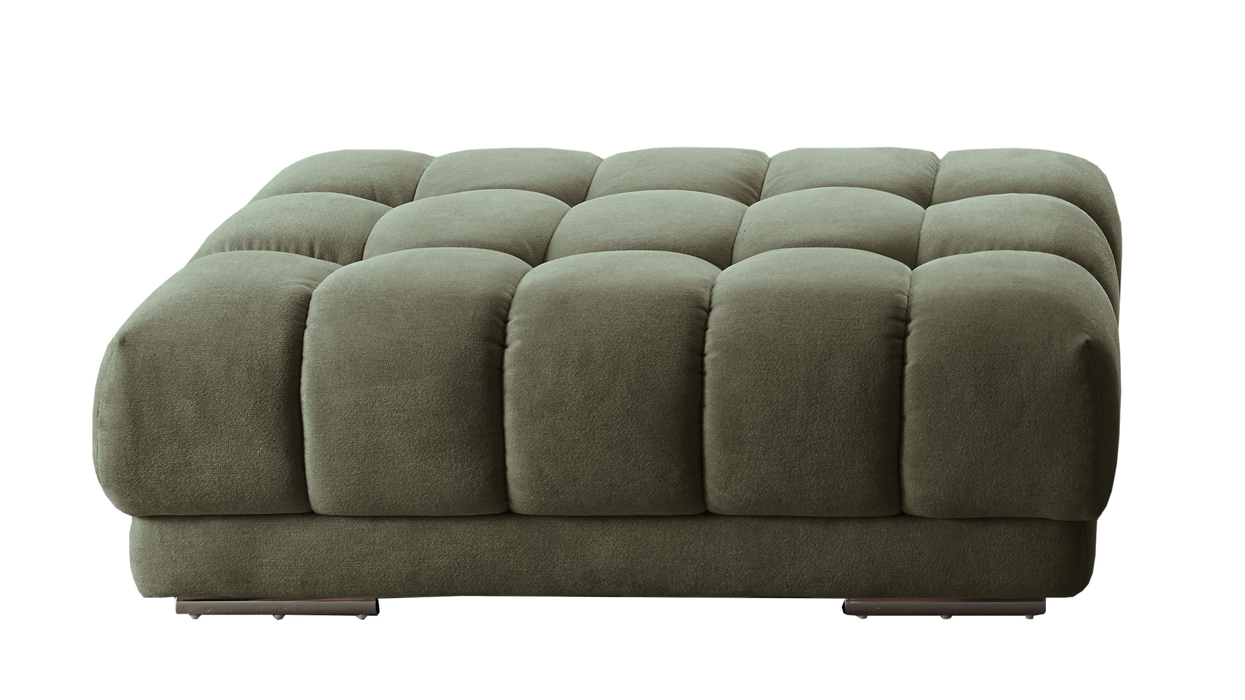 Er kombiniert silberfarbene Rollenfüße aus Metall, deren Robustheit die nötige Stabilität des Sitzmöbels gewährleistet, mit einem dunkel-moosfarbenen Chenillebezug, der vor allem durch seine weiche Haptik begeistert. Die perfekt aufeinander abgestimmten Farben verleihen dem Polsterhocker eine harmonisch-elegante und moderne Ausstrahlung. Für das gewisse Etwas sorgt die gesteppte Sitzfläche.
