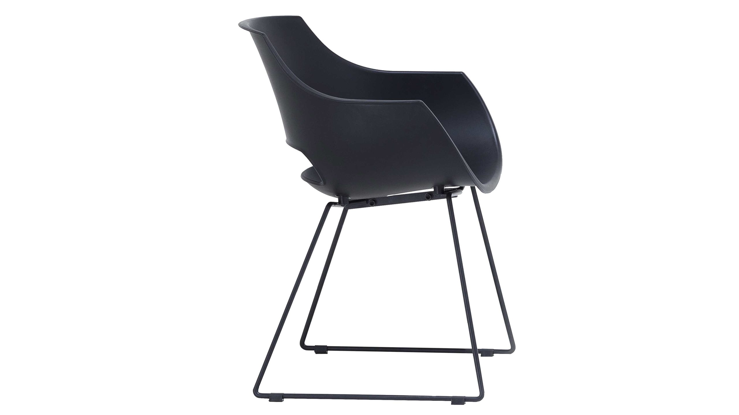 Er kombiniert eine Sitzschale aus mattschwarzem Kunststoff mit einem filigranen und ebenfalls mattschwarz lackierten Metallkufengestell. Durch die Materialien und Farben verknüpft der Esszimmerstuhl schlichte Modernität mit puristischer Eleganz und ergibt ein attraktives Sitzmöbel.